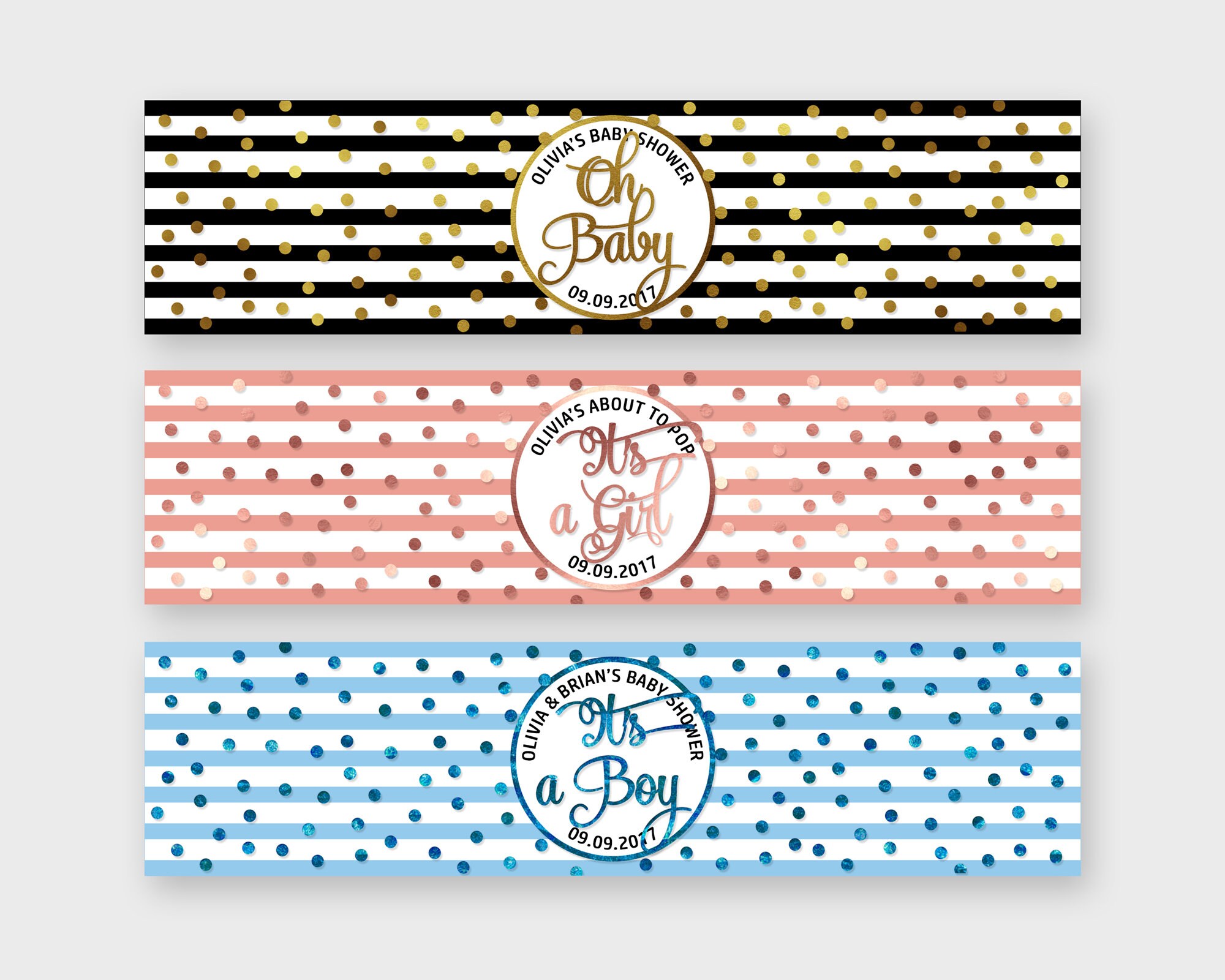 32 Free Water Bottle Label Templates For Any Occasion Hosting a baby shower, baby sprinkle, baby naming, or gender reveal? These water bottle label templates are sure to make the parents-to-be feel loved and your party guests feel special. Customize the colors, animals, and more to match the theme of your event. Then hand out as party favors or place around the event as refreshments. Chevron Shower