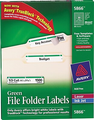 Avery File Folder Labels, 2/3" x 3-7/16", 1,500 Green Labels (5866 ... Avery Print or Write File Folder Labels, 11/16 x 3 7/16, White/Dark Red Bar, 252/Pack. Add. $3.39. current price $3.39. $5.79. was $5.79. ... The Avery file folder labels print without smearing in our inkjet printer. Sheets feed reliably without misfeeds. Good quality labels. pnatbc.